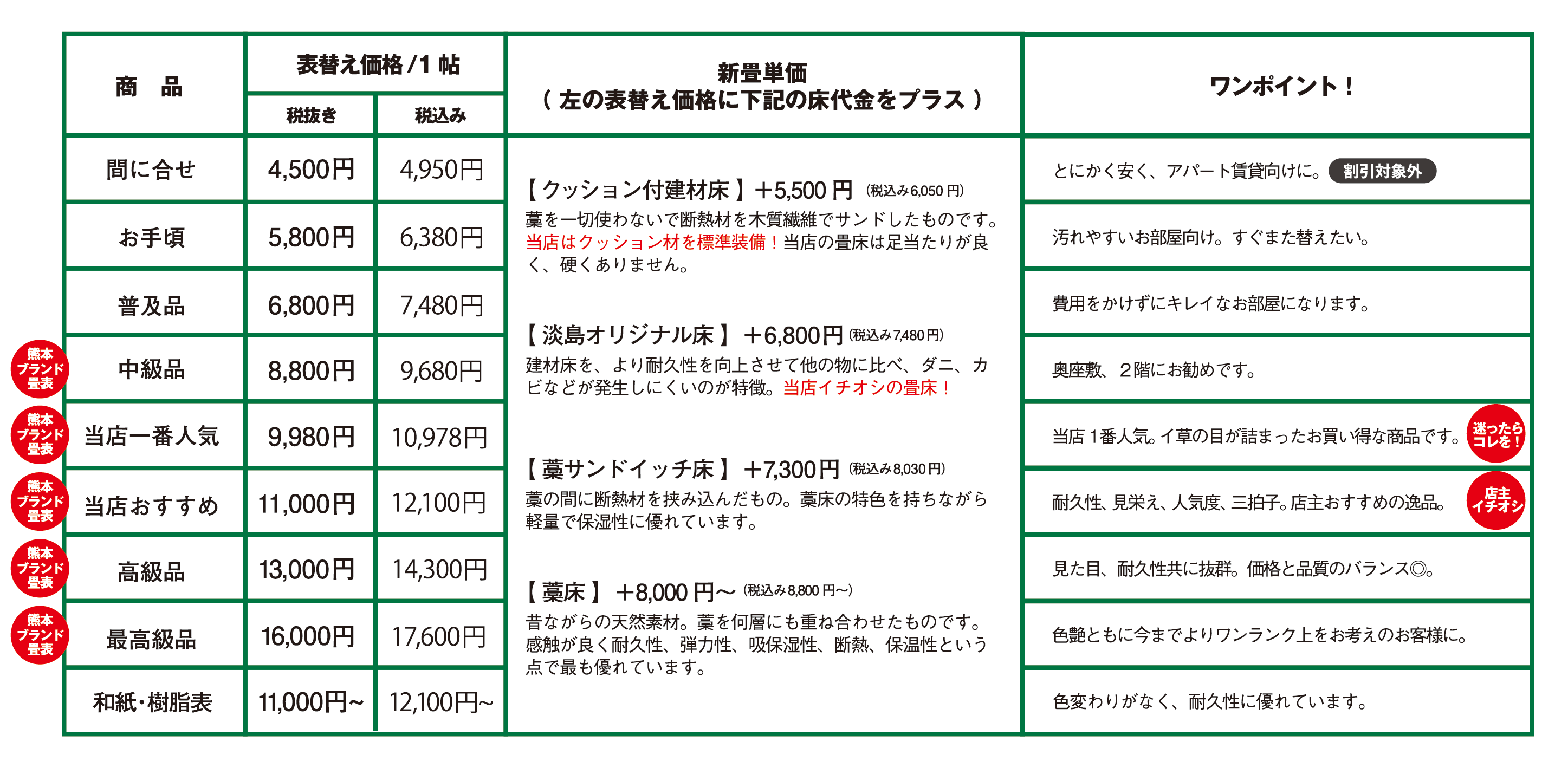 ※半畳は1帖の70% 基本サイズ以上(180cm×90cm以上)は2割増し。特殊加工は別途料金